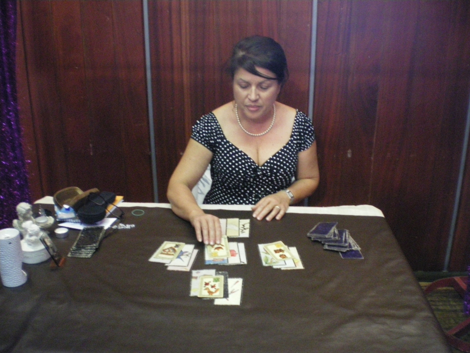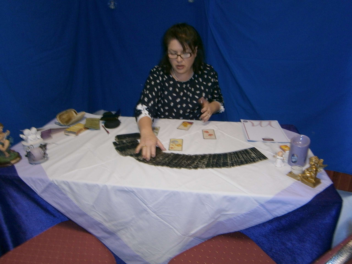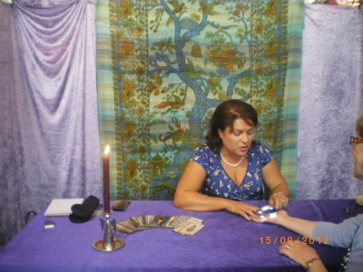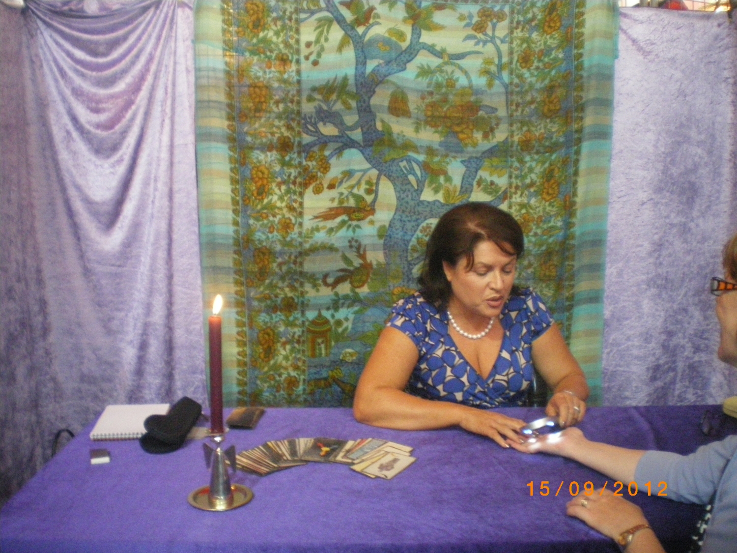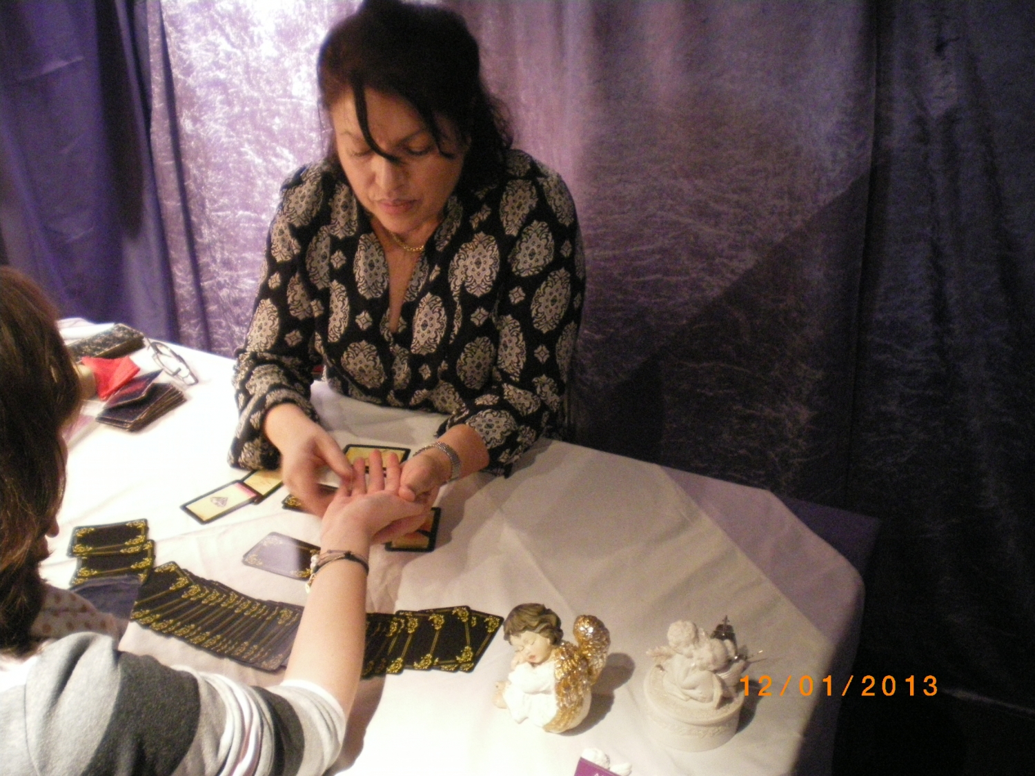 Athina au palais Beaubourg pendant le salon Bien-être et Voyance de Blotzheim les 15-16 septembre 2012 débute sa consultation par la chiromancie (lecture des lignes de la main) puis une étude globale par la tarologie.