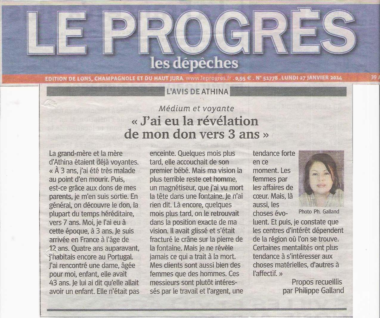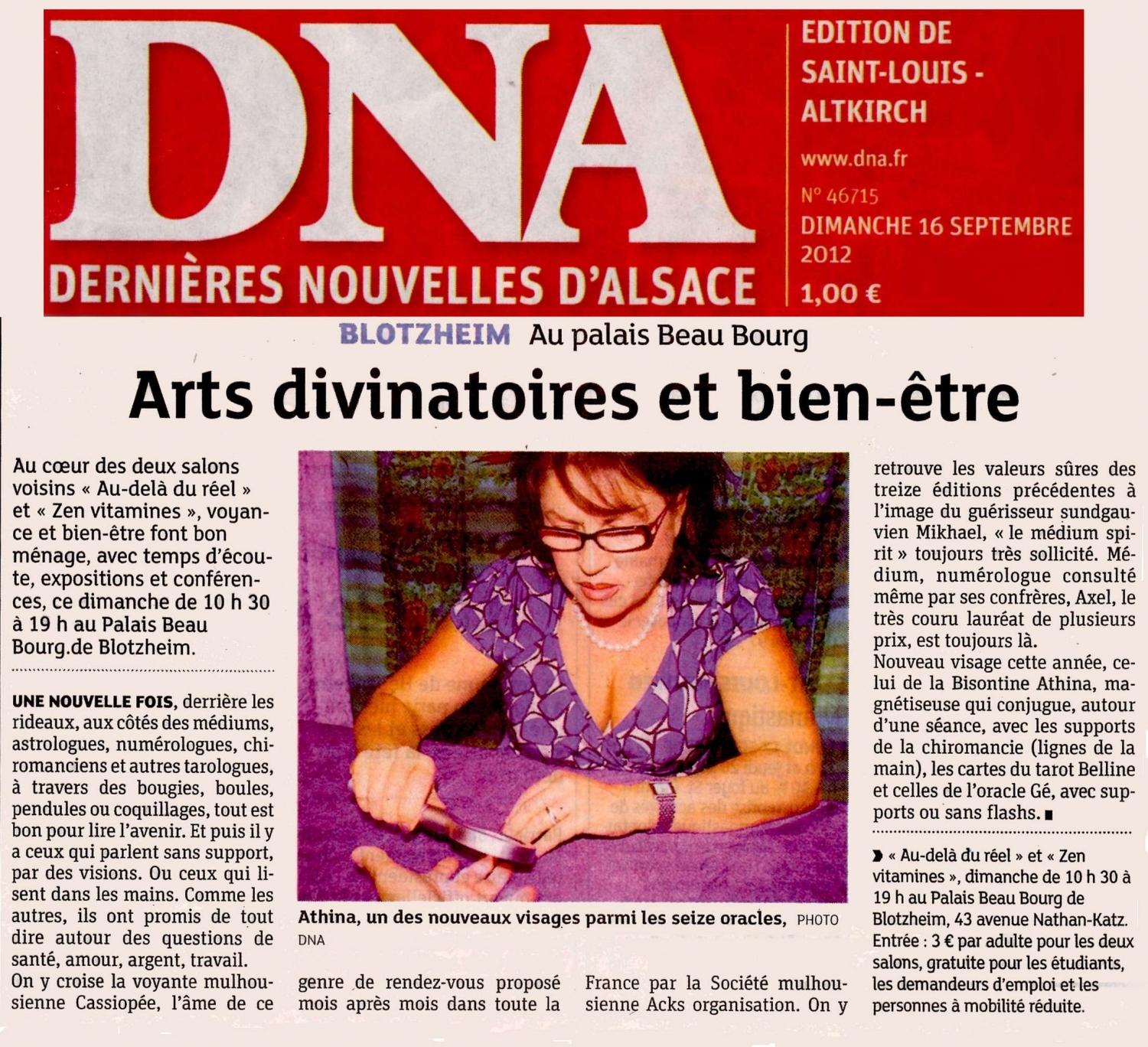 Athina est régulièrement invitée à des salons sur le thème de la voyance. Cliquez sur la vignette pour lire l'article de l'Est Républicain sur le salon de la voyance de Besançon les 24 et 25 mars 2012.