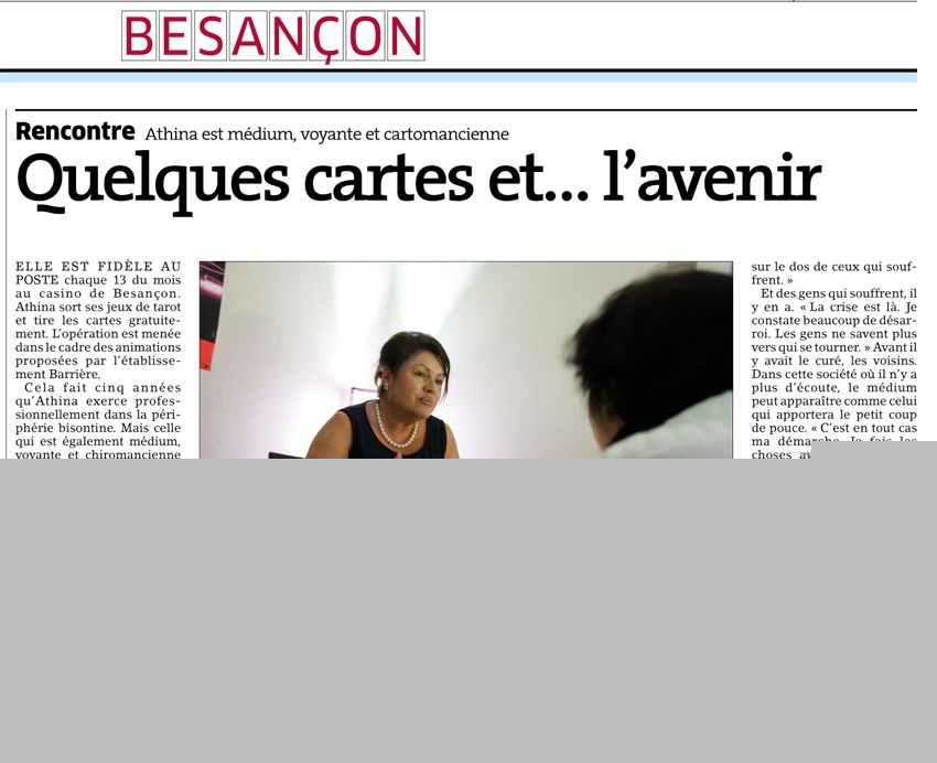Athina dans le journal l'Est Républicain du mardi 14.5.2013 pour sa participation aux consultations de voyance qui ont lieu tous les 13 du mois au Casino Barrière à Besançon.